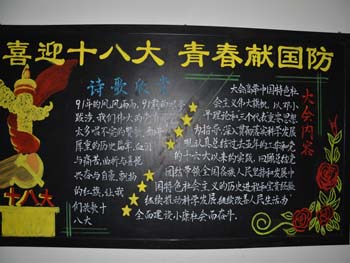 在十八大召开前夕,国防生板报兴趣小组成员利用课余时间,专门出版了两期专题板报,宣传十八大即将召开,引导大家关注十八大,学习十八大精神,并借板报以诗歌的形式抒发国防生迎接十八大召开的喜悦之情。