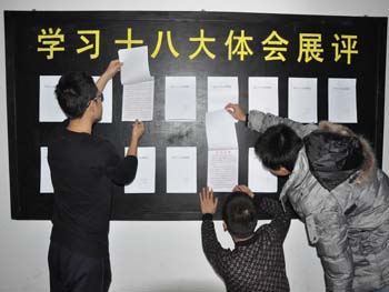 十八大胜利闭幕后,在学习探讨十八大精神的基础上,国防生主动撰写体会文章,将连日以来的学习体会形成书面文字,表达作为一名国防生的光荣感和使命感,制作学习体会展板,评选优秀学习体会进行展评。选培办干部也积极关注国防生在十八大期间思想动态,主动考上前去,与国防生交流探讨,鼓舞国防生再接再厉,做好眼前工作,争取更大成绩。