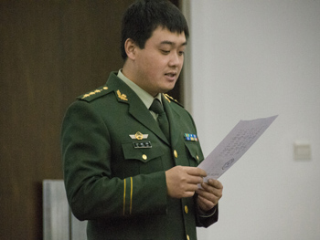 于干事宣读了武警总部关于确认国防生资格的批复,宣布全体14级国防生正式取得国防生资格,为国防生代表颁发了本学年国防奖学金。2014级国防生代表于博文同学在仪式上发言,表示一定不会辜负国家和部队的深切关怀,在四年的大学生活中积极提升自身素质,努力成长为一名优秀的武警后备警官。